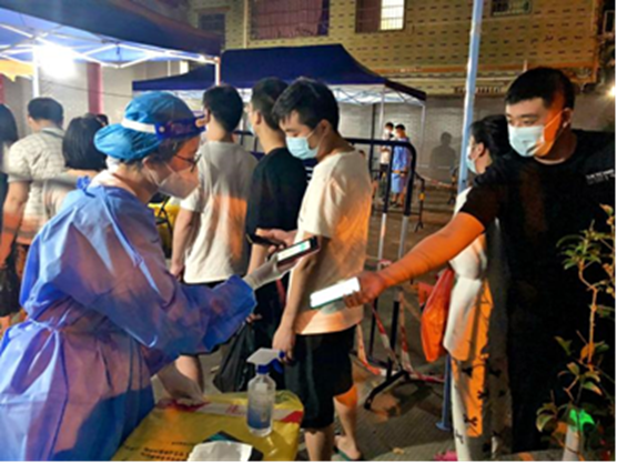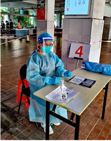 于是,彭素新同志從4月4日開始下沉社區(qū),社區(qū)有工作就在社區(qū)干,社區(qū)當天沒有工作就趕回公司干。下沉期還未結束就遇上了廣州新的一波疫情,所在社區(qū)被列入防范區(qū),彭素新同志4月9日、10日連續(xù)兩日參加社區(qū)核酸檢測服務;4月12日,上級有支援任務下來了,又趕赴天河區(qū)參加支援;4月15日晚,社區(qū)緊急開展核酸檢測亟需大量志愿者,快速完成手頭工作后又趕回社區(qū)服務直至凌晨。